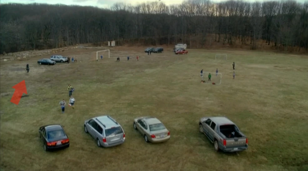 Наблюдатель стоит рядом с футбольным полем, недалеко от которого падает самолёт.