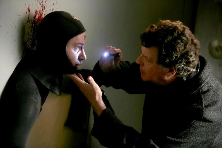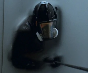 They then stretch a large black tarp over the vault wall, and after running a charge through it, it begins to oscillate rapidly. Loeb then gives the command for two others to fire a large tow cable at the wall, but instead of striking the wall, the cable passes straight through it. Loeb and two others use the cable to pull themselves through the wall. Upon reaching the inside of the vault, the harpoon is seen attached magnetically to a safety deposit box. One of the men comments that they only have "57 seconds" left. They move to safety deposit box 610 and open it using a small explosive charge. They remove a heavy box, attach it to the harpoon cable and push it through the wall. As the men pull themselves back out, the last man struggles to loosen the tow cable. As he unhooks the harpoon and is pulled through the wall by his companions, it solidifies around him -- trapping him within the wall. With nothing left to do, Loeb, with no hesitation, shoots the trapped man in the head, leaving his body hanging out of the wall.