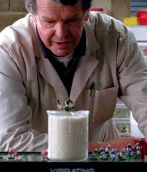 At the Harvard Laboratory, Walter demonstrates how the robbers got through the wall. Walter explains that the tarp found on the vault door was used to conduct a high-frequency vibration on an atomic level, allowing the robbers to weaken the wall and pass through it. Using a beaker of uncooked rice sitting on top of a vibrating football game, Walter illustrates the process.