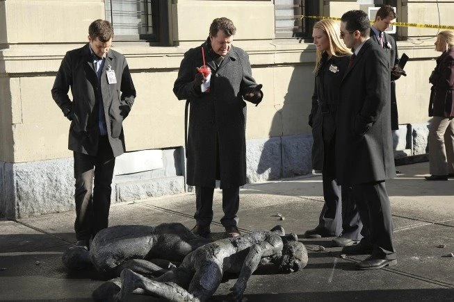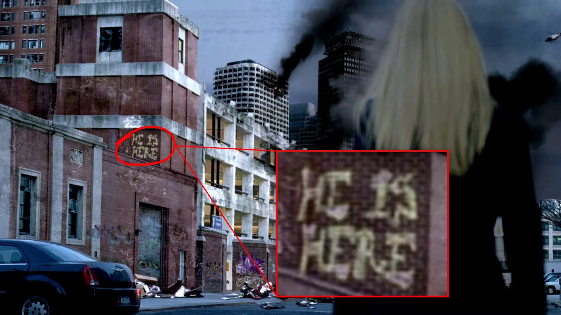 - In Olivia's 'vision,' there is graffiti on the building on the left of the frame that states 'He is here' - possibly referring to William Bell being in the other universe.